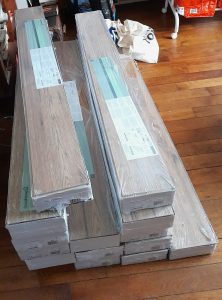 Nous comparons sur Internet les différentes possibilités et nous nous arrêtons sur du parquet stratifié en lames à clipser. Sur le site d’une grande enseigne de bricolage, nous repérons quelques modèles qui devraient nous plaire. Après avoir fait nos calculs, il nous faudrait 31 paquets, pesant chacun 16kg, soit au total… une demi-tonne. Il faut ajouter à cela la sous-couche en mousse qui, si elle ne pèse quasiment rien, est plutôt encombrante. Nous décidons donc de nous faire livrer, moyennant un supplément de 49 euros.
