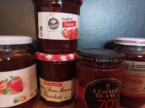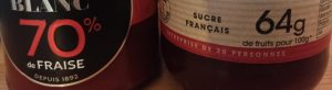 Elle a la couleur de la confiture de fraises, elle a l’allure d’un pot de confiture de fraises mais ce n’est pas de la confiture et d’ailleurs le mot confiture est absent de l’étiquette : Ce sont des préparations de fraises.