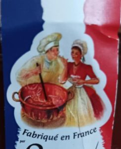 Pour l’une Lucien Georgelin, on a une belle étiquette un peu genre faite maison, avec une belle fraise, sur l’image, deux personnes qui cuisent au chaudron, et le drapeau français parce que fabriqué en France mais là, même si le produit contient 45 % de fraises, on ne voit pas tout de suite que le fabricant ajoute 15 % de pommes, a priori moins cher.